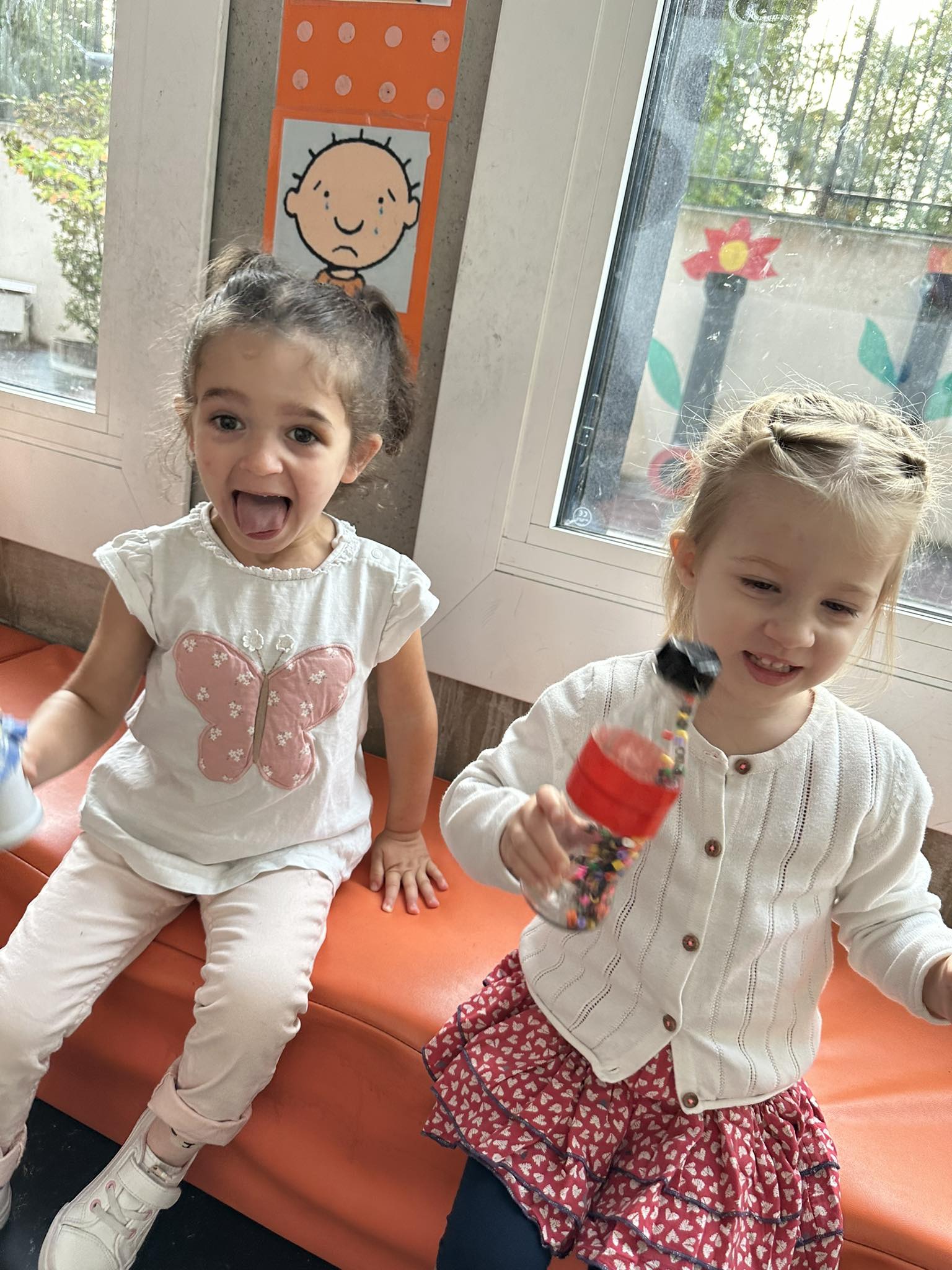 Aangezien de zon heel de week scheen (waar we wel heel blij om zijn 😏), hingen we zelf regendruppeltjes aan onze paraplu. Dan maken we zelf maar regen! Rolledebolle met de knikkers in een doos... Wat hebben we nu een leuk regenportret van ons in de regen.